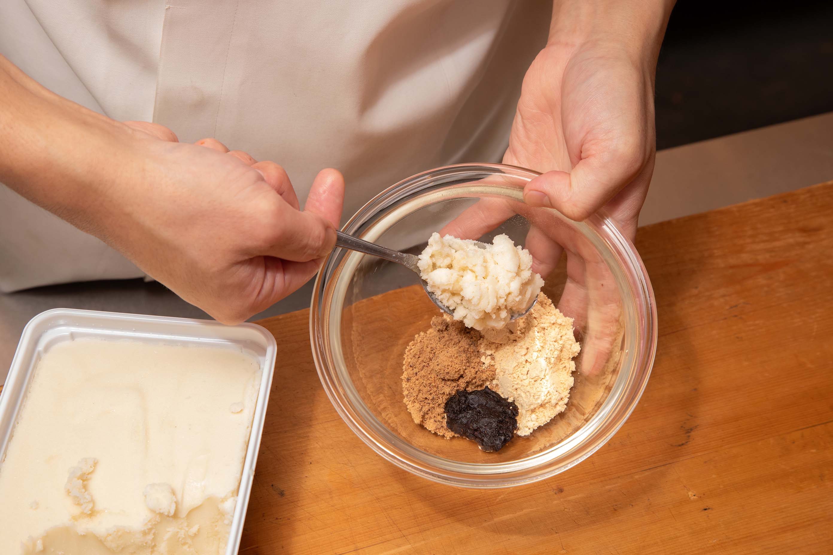 [d]ヴィーガンアイスと他の材料を 混ぜ合わせている様子