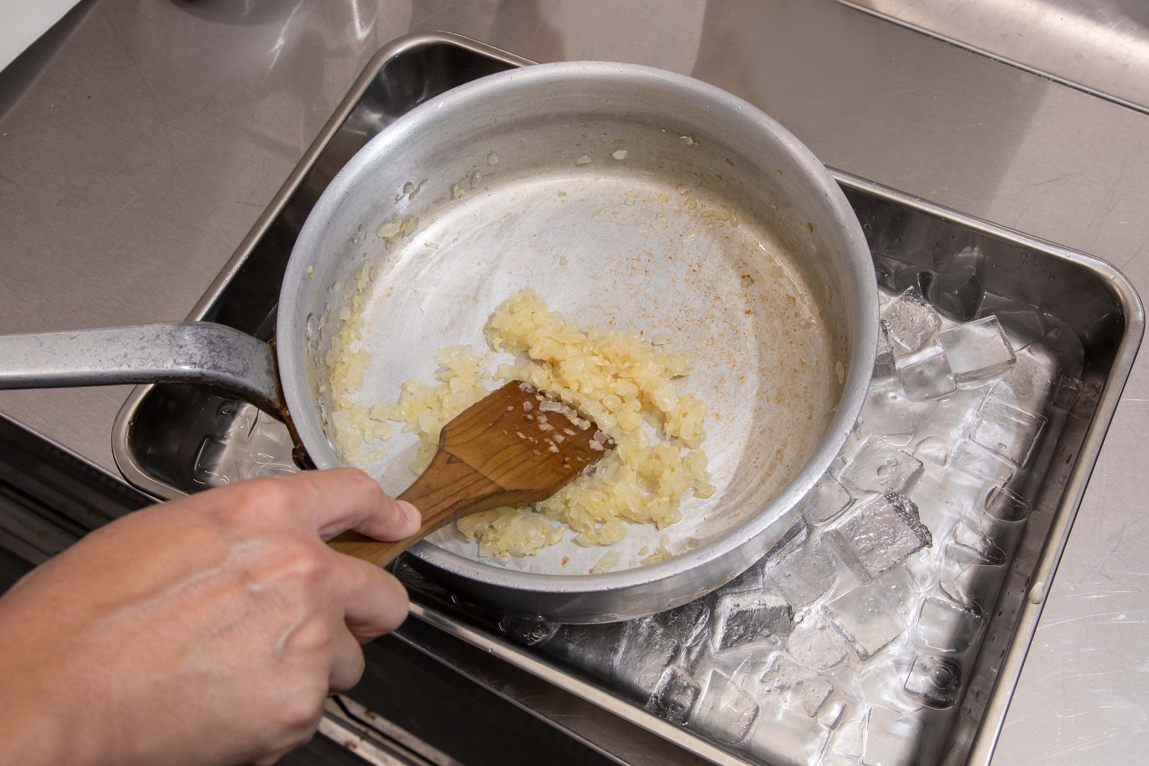 ⑤ 氷水に置き、炒めた玉ねぎの粗熱がとれたら、【B】