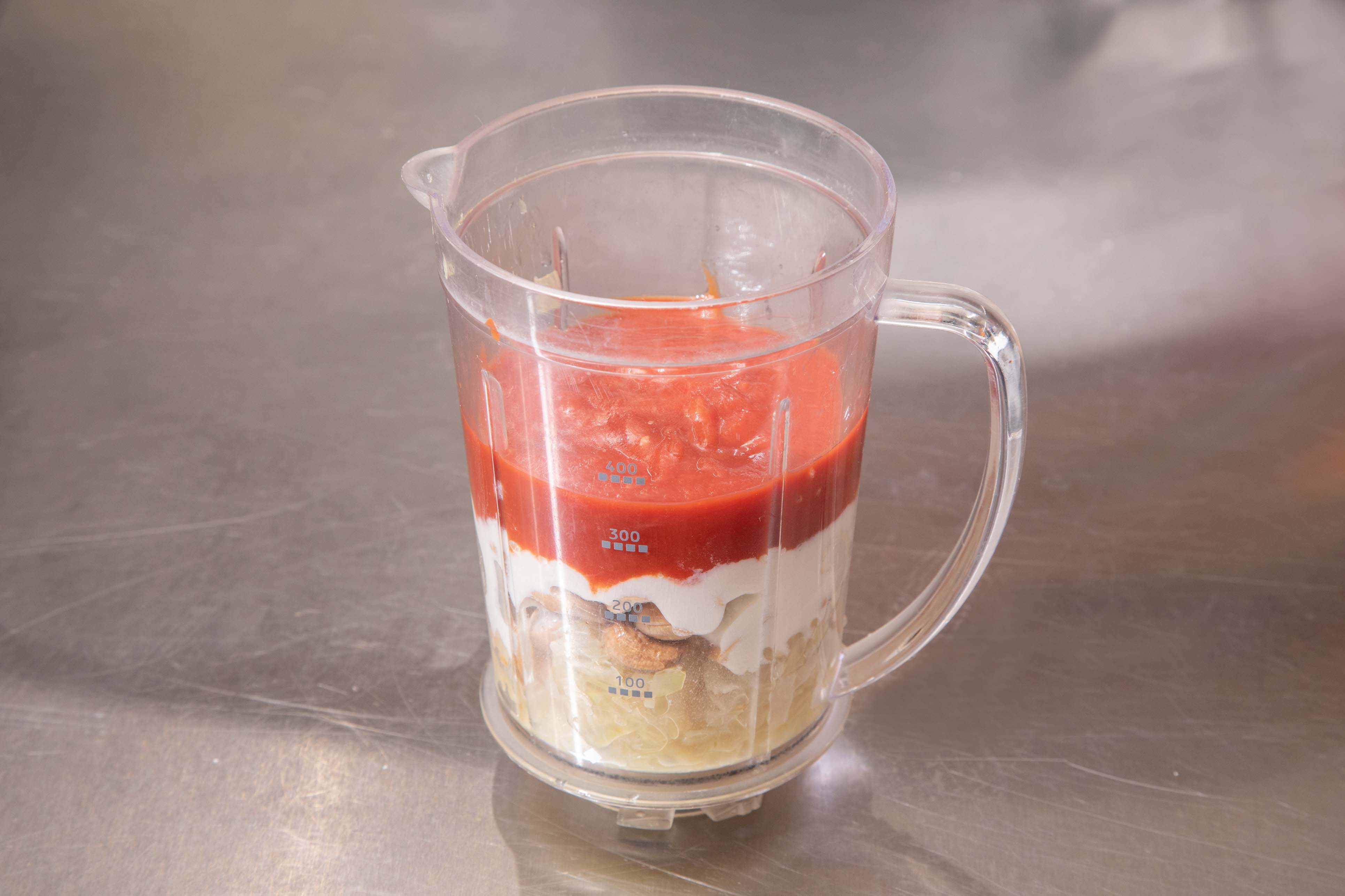 (カシューナッツは水気を切る)を加えてミキサーで攪拌する。