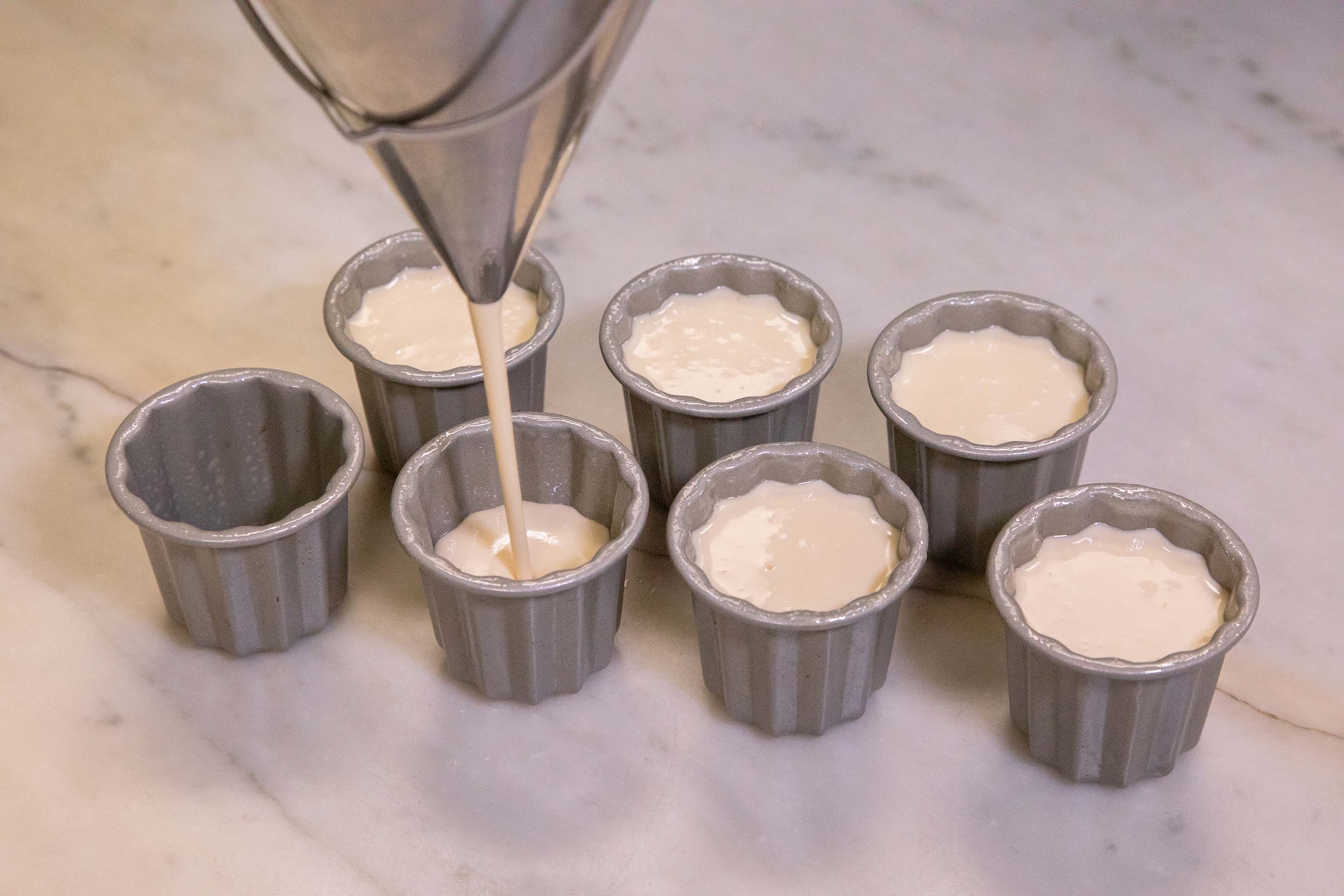 [d]カヌレ型に生地を流し入れる様子